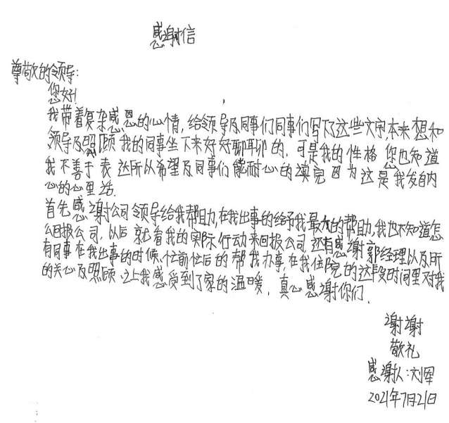 经过半个月治疗休养,刘军手部已无大碍。出院后的他写了一封感谢信并为公司送了一面锦旗,他说道,是兰州阳光健康饮食咨询有限公司这个大家庭让他感受到了关怀和温暖,他表示要把这种关怀变成工作上的动力,争取早日返回工作岗位,努力工作,回报大家的关心和关爱。